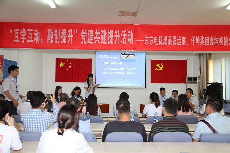 在東電成品發運部黨支部黨建陣地,開展了以“企業改革是否需要傷經動骨”為主題的辯論賽,正反雙方開展了激烈辯論,現場氣氛熱烈火藥味十足。在吳云華書記宣講了黨課,組織委員交流工作圖表后,雙方黨支部委員簽訂了互學互動承諾書。東電成品發運部黨支部書記吳云華表示,要加強共建支部之間的交流學習,共同促進共同提高,進一步增強共建學習效果,不斷夯實雙方黨支部黨建基礎,提升黨建科學化水平,體現共建合力。