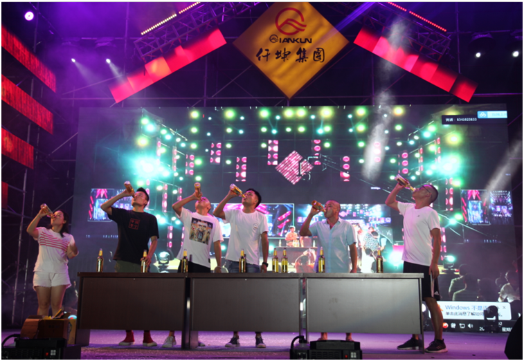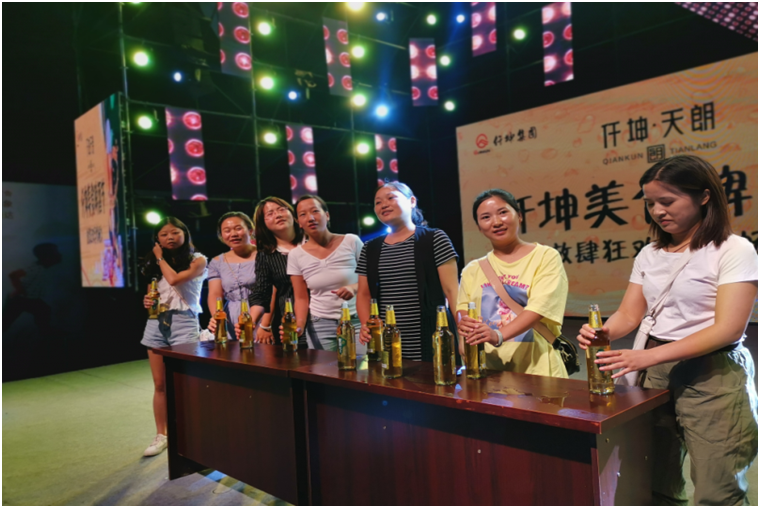 “六位啤酒一個組,兩瓶啤酒,誰最快飲下,誰就是冠軍!前三名獎品豐厚哦。”主持人向現場觀眾介紹著啤酒大賽的規則。現場,貴州安順和綿竹兩地同時舉行啤酒節,當互動屏幕打開時,兩地參賽者同時舉起酒瓶開始比拼模式,雖隔著屏幕,亦能感受激烈精彩的氛圍。“加油,雄起……”臺下兩地觀眾不停地為臺上的參賽選手鼓勁、打氣。“16秒,我們的冠軍產生啦!啤酒大人李文僅用了8秒就喝完了一瓶750ml的啤酒,兩瓶酒16秒就喝完了,真是高手在民間啊。”伴隨著主持人宣布大賽的成績,大家都舉起手中的酒杯,為冠軍喝彩。被盛邀參加啤酒節的貴州安順人楊昌倫表示,仟坤集團特意邀請了貴州安順的業主和表演團隊來到綿竹,兩地同時舉行啤酒節,現場互動,既豐富了本地的文化生活,又吸引了很多外地朋友,讓更多的人了解仟坤,仟坤有實力,作為業主感到自豪。
