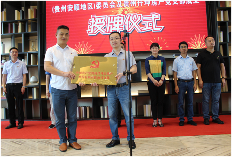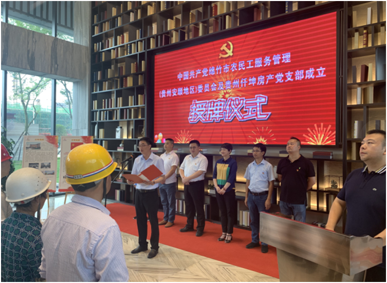 6月21日上午,中國共產(chǎn)黨綿竹市農(nóng)民工服務(wù)管理(貴州安順地區(qū))委員會及貴州仟坤房產(chǎn)黨支部成立授牌儀式在貴州安順仟坤.天朗售房中心隆重舉行。綿竹市市委常委、組織部部長李偉,貴州安順經(jīng)開區(qū)黨工委委員、紀(jì)工委書記雷珺茗,綿竹市高新區(qū)黨工委委員、紀(jì)工委書記馮曉敏,仟坤集團(tuán)總裁謝澤波,仟坤集團(tuán)黨委書記、副總裁周述軍,仟坤集團(tuán)黨建指導(dǎo)員劉佩章,貴州安順仟坤房產(chǎn)總經(jīng)理、黨支部書記秦永明出席儀式。本次授牌、揭牌儀式由仟坤集團(tuán)總裁謝澤波主持。