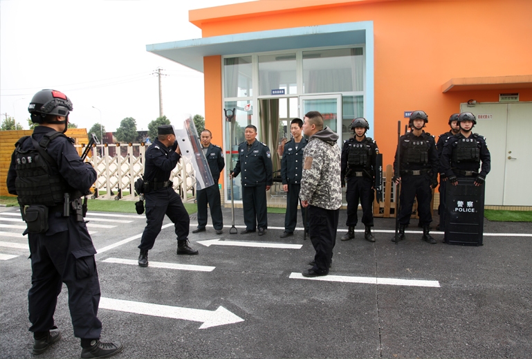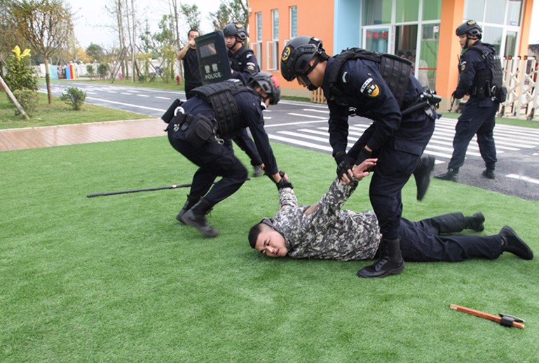 隨即,幼兒園保安和特巡警員共同進行了恐怖襲擊場景模擬。忽然,一名持斧頭的男子試圖闖進幼兒園來,大聲嚷嚷著要報復,還拿著斧頭四處揮舞,危險一觸即發。一鍵報警的東北派出所警車呼嘯趕到,全副武裝的民警果斷出擊,經過一番搏斗將"歹徒"成功制服,將其押上了警車。