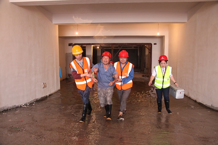 警笛呼嘯,演練模擬綿竹市區雷電交加突降暴雨,建筑工人被雨水沖淋,集水坑瞬間大量積水,向周邊擴散,出現險情。搶險救援組聞“汛”而動,進場對現場進行有效救援,同時警戒疏散組、物資保障組、臨電搶險組、防洪沙袋救援組、抽水小組、醫療小組緊急開展搶險救援工作,各個小組銜接緊密,配合默契,不到半個小時就完成了對“險情”的處置。